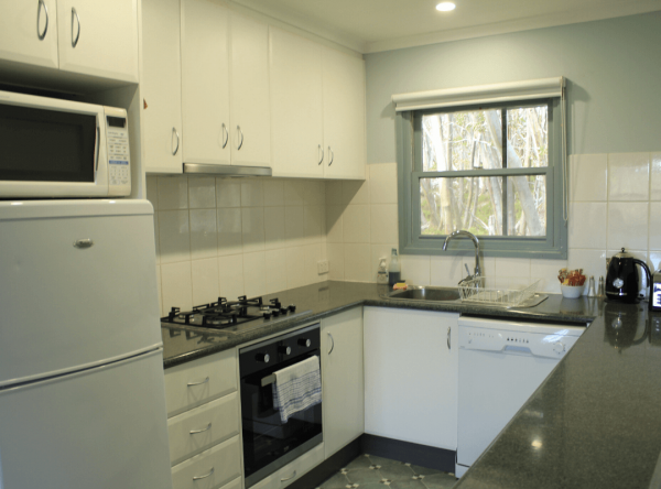 • Includes stovetop, microwave, fridge, toaster, kettle, and cookware