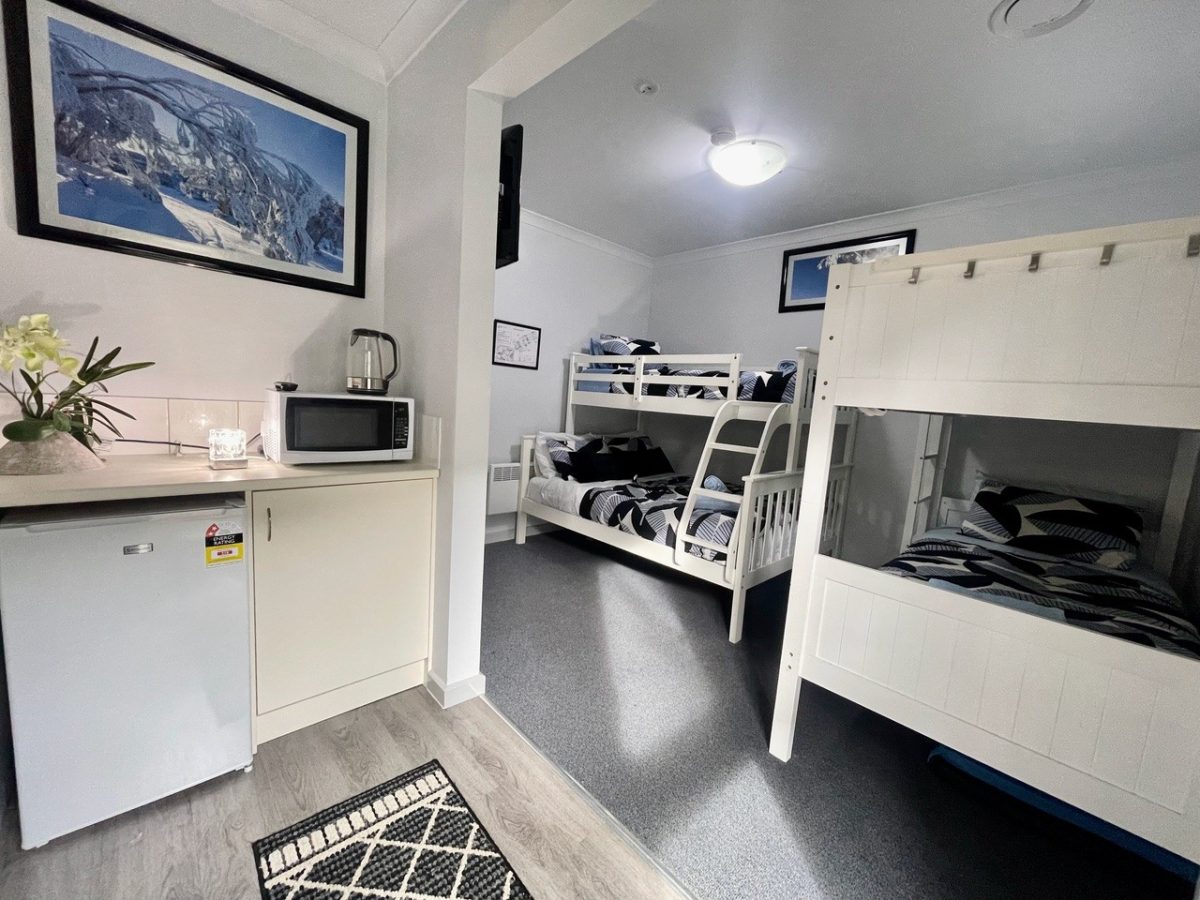 Tanjil Creek Lodge is located in the centre of Mt Baw Baw’s village, containing four lockable bedrooms, each with their own bathroom. There is a fully equipped shared kitchen and lounge with a smart TV, a gas log fire and drying room. You can book rooms individually or the whole lodge (rooms 1-4), suiting couples, families or large groups.